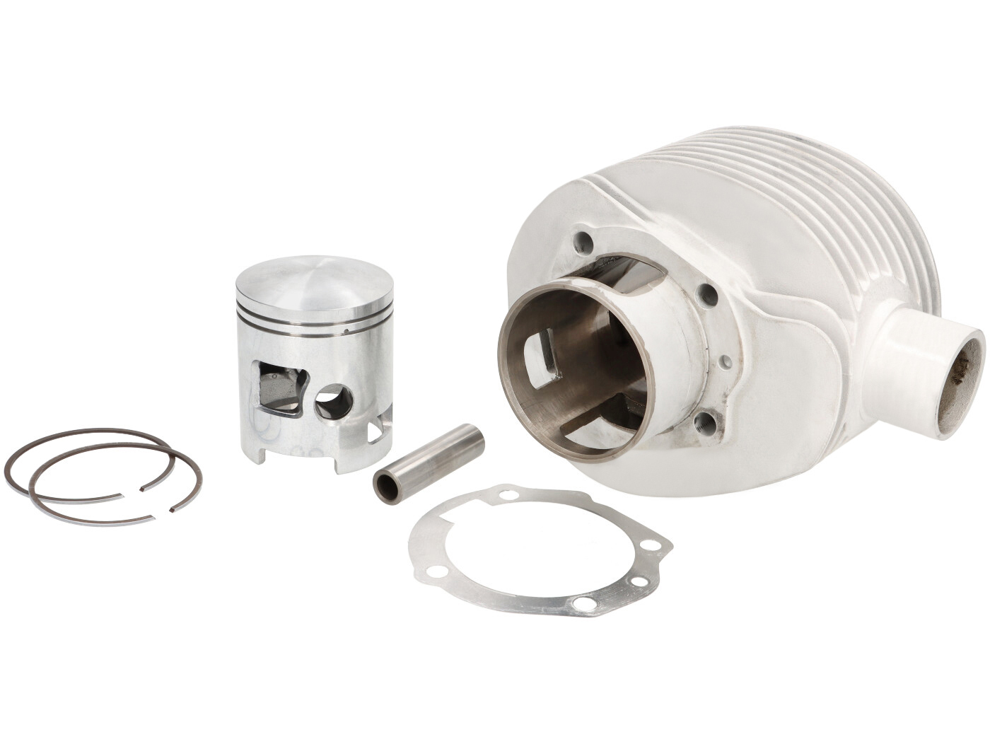 Ce cylindre est très similaire à l’original de Piaggio. Il peut être simplement utilisé comme un remplacement plug and play. Cependant, deux détails ont fait l’objet d’une mise à jour contemporaine : Tout d’abord, l’aluminium avec un chemin de roulement revêtu a été choisi comme matériau. D’autre part, le cylindre possède cinq canaux de débordement au lieu de trois.